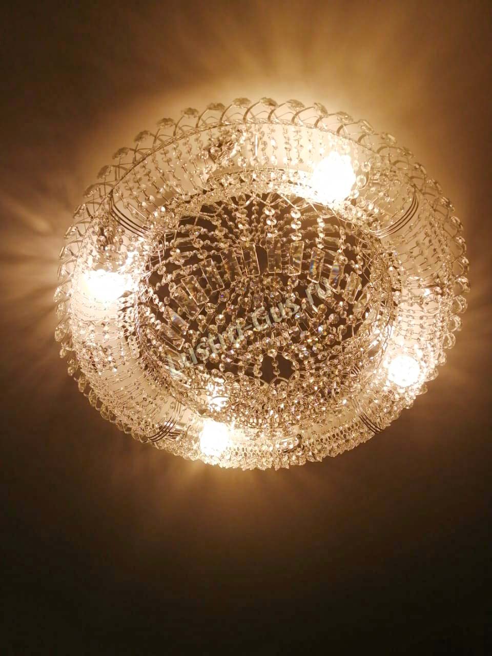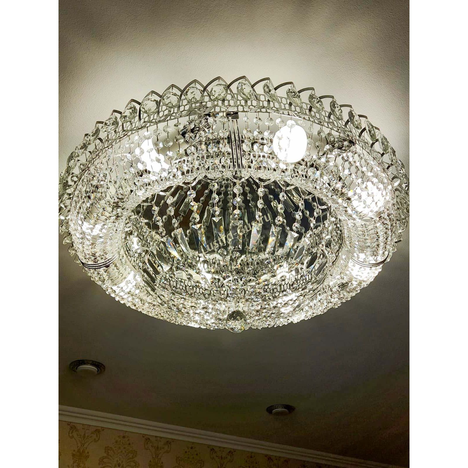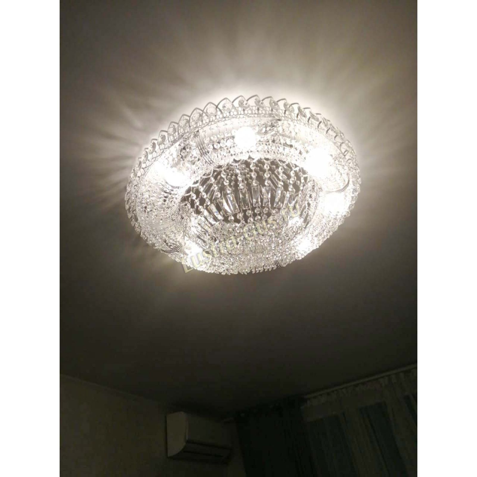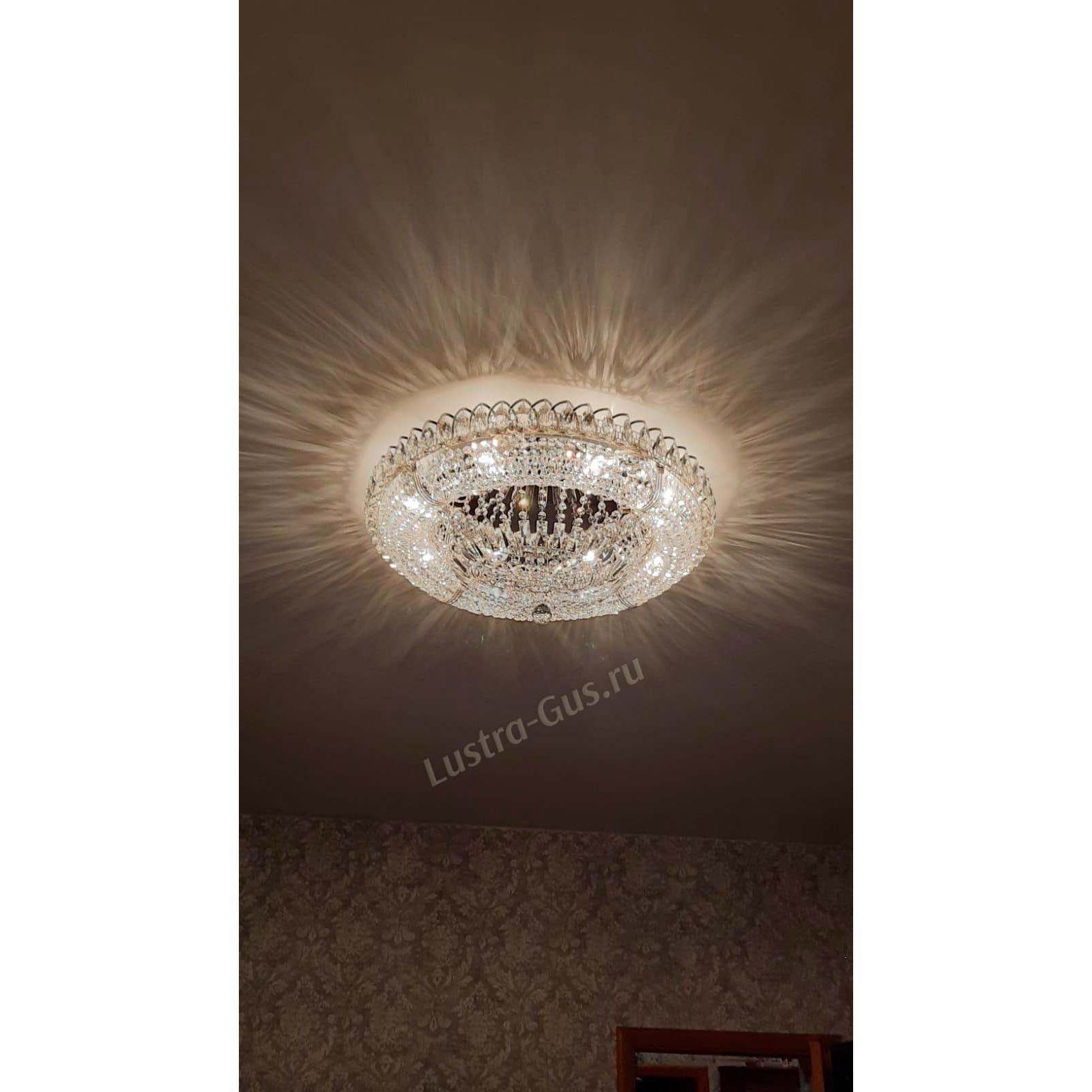 Добрый день! Купили потолочную люстру в мае. Очень довольны, доставка отличная, очень хорошо упакована, красивая и воздушная, размер 70см, в комнате 18кв отлично смотрится. ГУСЬ ХРУСТАЛЬ, СПАСИБО!!